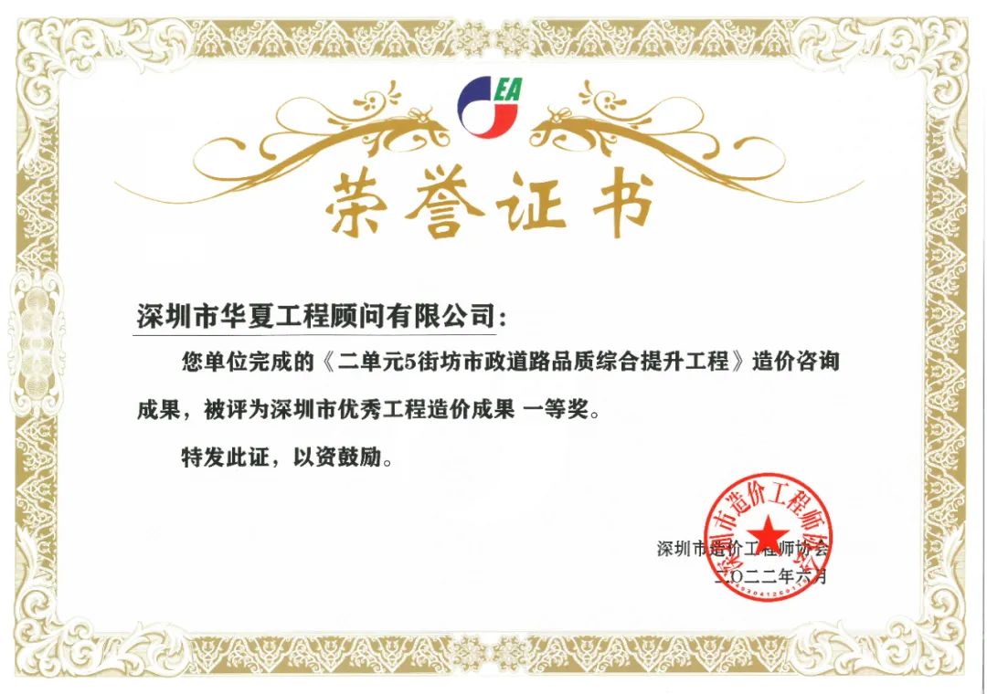 2.我司“二單元5街坊市政道路品質綜合提升工程”榮獲優秀造價咨詢成果獎一等獎